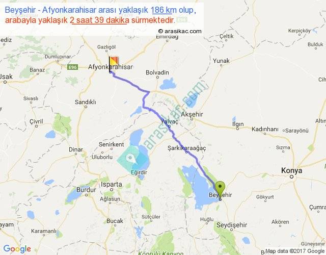 Beyşehir - Afyonkarahisar arası yaklaşık olarak 90 km/h ile yukarıda belirtilen sürede olup, iki yerin kuş uçuşu uzaklığı (mesafesi) 157'dir. Yolculuk otobüsle 3 saat 26 dakika sürmektedir.