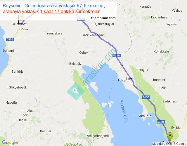 Beyşehir - Gelendost arası yaklaşık olarak 90 km/h ile yukarıda belirtilen sürede olup, iki yerin kuş uçuşu uzaklığı (mesafesi) 79'dir. Yolculuk otobüsle 1 saat 40 dakika sürmektedir.