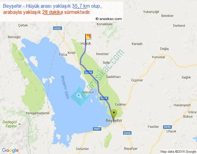 Beyşehir - Hüyük arası yaklaşık olarak 90 km/h ile yukarıda belirtilen sürede olup, iki yerin kuş uçuşu uzaklığı (mesafesi) 32'dir. Yolculuk otobüsle 36 dakika sürmektedir.