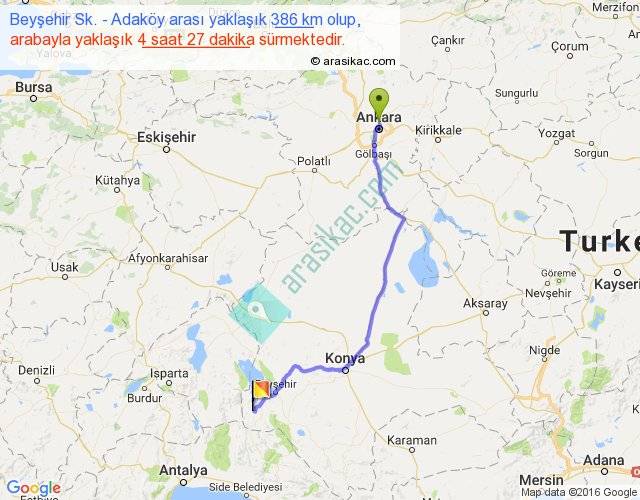 Beyşehir Sk. - Adaköy arası yaklaşık olarak 90 km/h ile yukarıda belirtilen sürede olup, iki yerin kuş uçuşu uzaklığı (mesafesi) 297'dir. Eğer belirtilen yerler arasında uçak seferi var ise bu süre uçakla 27 dakika'ya kadar düşebilir. Yolculuk otobüsle 5 saat 47 dakika sürmektedir.