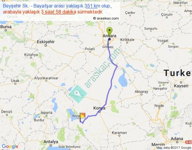 Beyşehir Sk. - Bayafşar arası yaklaşık olarak 90 km/h ile yukarıda belirtilen sürede olup, iki yerin kuş uçuşu uzaklığı (mesafesi) 280'dir. Eğer belirtilen yerler arasında uçak seferi var ise bu süre uçakla 25 dakika'ya kadar düşebilir. Yolculuk otobüsle 5 saat 9 dakika sürmektedir.