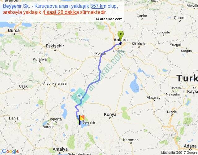 Beyşehir Sk. - Kurucaova arası yaklaşık olarak 90 km/h ile yukarıda belirtilen sürede olup, iki yerin kuş uçuşu uzaklığı (mesafesi) 282'dir. Eğer belirtilen yerler arasında uçak seferi var ise bu süre uçakla 26 dakika'ya kadar düşebilir. Yolculuk otobüsle 5 saat 48 dakika sürmektedir.