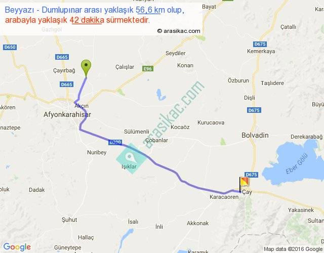 Beyyazı - Dumlupınar arası yaklaşık olarak 90 km/h ile yukarıda belirtilen sürede olup, iki yerin kuş uçuşu uzaklığı (mesafesi) 45'dir. Yolculuk otobüsle 54 dakika sürmektedir.