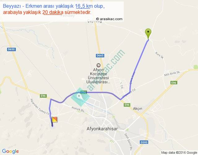 Beyyazı - Erkmen arası yaklaşık olarak 90 km/h ile yukarıda belirtilen sürede olup, iki yerin kuş uçuşu uzaklığı (mesafesi) 12'dir. Yolculuk otobüsle 26 dakika sürmektedir.