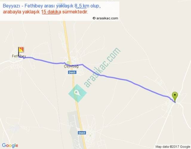 Beyyazı - Fethibey arası yaklaşık olarak 90 km/h ile yukarıda belirtilen sürede olup, iki yerin kuş uçuşu uzaklığı (mesafesi) 8'dir. Yolculuk otobüsle 19 dakika sürmektedir.