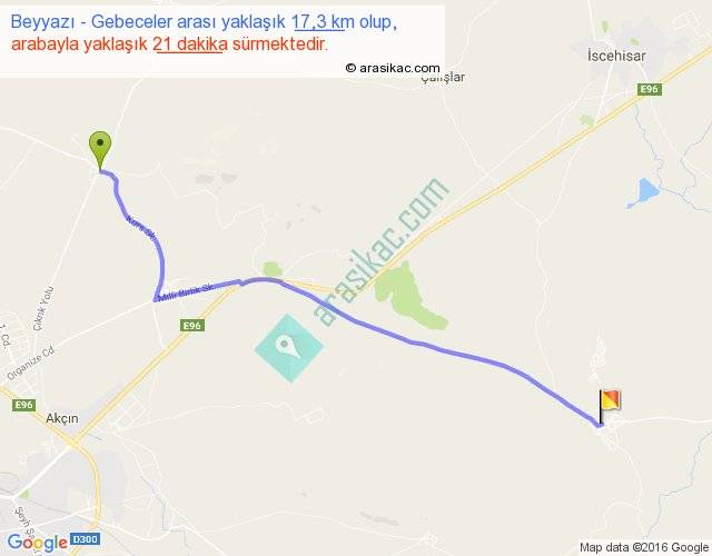 Beyyazı - Gebeceler arası yaklaşık olarak 90 km/h ile yukarıda belirtilen sürede olup, iki yerin kuş uçuşu uzaklığı (mesafesi) 15'dir. Yolculuk otobüsle 27 dakika sürmektedir.