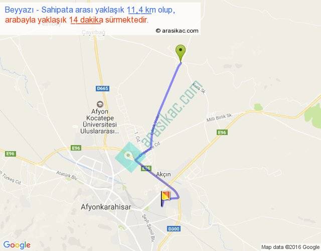 Beyyazı - Sahipata arası yaklaşık olarak 90 km/h ile yukarıda belirtilen sürede olup, iki yerin kuş uçuşu uzaklığı (mesafesi) 9'dir. Yolculuk otobüsle 18 dakika sürmektedir.