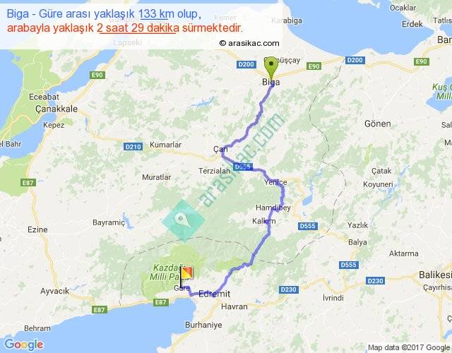 Biga - Güre arası yaklaşık olarak 90 km/h ile yukarıda belirtilen sürede olup, iki yerin kuş uçuşu uzaklığı (mesafesi) 74'dir. Yolculuk otobüsle 3 saat 13 dakika sürmektedir.