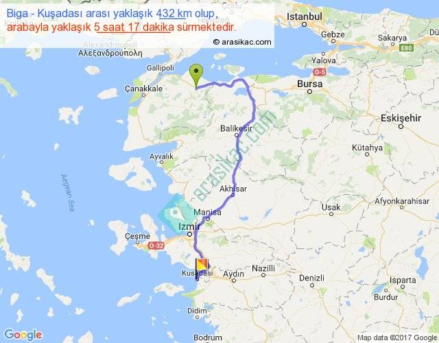 Biga - Kuşadası arası yaklaşık olarak 90 km/h ile yukarıda belirtilen sürede olup, iki yerin kuş uçuşu uzaklığı (mesafesi) 262'dir. Eğer belirtilen yerler arasında uçak seferi var ise bu süre uçakla 24 dakika'ya kadar düşebilir. Yolculuk otobüsle 6 saat 52 dakika sürmektedir.