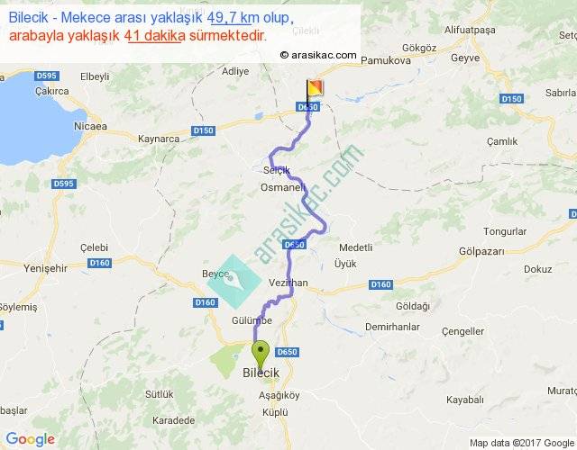 Bilecik - Mekece arası yaklaşık olarak 90 km/h ile yukarıda belirtilen sürede olup, iki yerin kuş uçuşu uzaklığı (mesafesi) 35'dir. Yolculuk otobüsle 53 dakika sürmektedir.