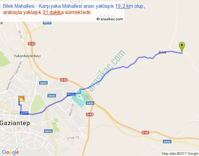 Bilek Mahallesi - Karşıyaka Mahallesi arası yaklaşık olarak 90 km/h ile yukarıda belirtilen sürede olup, iki yerin kuş uçuşu uzaklığı (mesafesi) 17'dir. Yolculuk otobüsle 27 dakika sürmektedir.