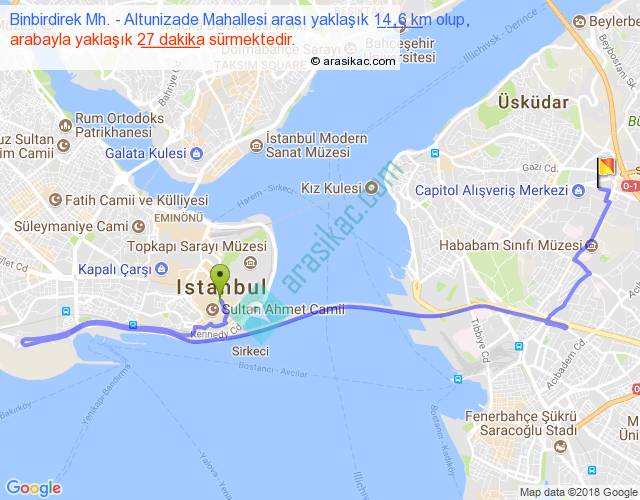 Binbirdirek Mh. - Altunizade Mahallesi arası yaklaşık olarak 90 km/h ile yukarıda belirtilen sürede olup, iki yerin kuş uçuşu uzaklığı (mesafesi) 6'dir. Yolculuk otobüsle 35 dakika sürmektedir.