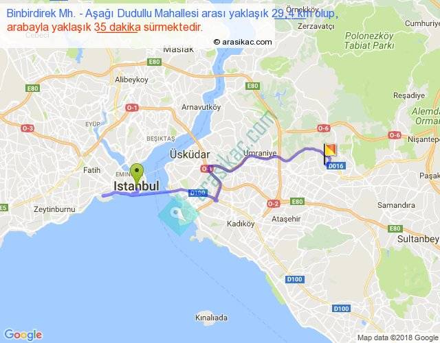 Binbirdirek Mh. - Aşağı Dudullu Mahallesi arası yaklaşık olarak 90 km/h ile yukarıda belirtilen sürede olup, iki yerin kuş uçuşu uzaklığı (mesafesi) 16'dir. Yolculuk otobüsle 45 dakika sürmektedir.
