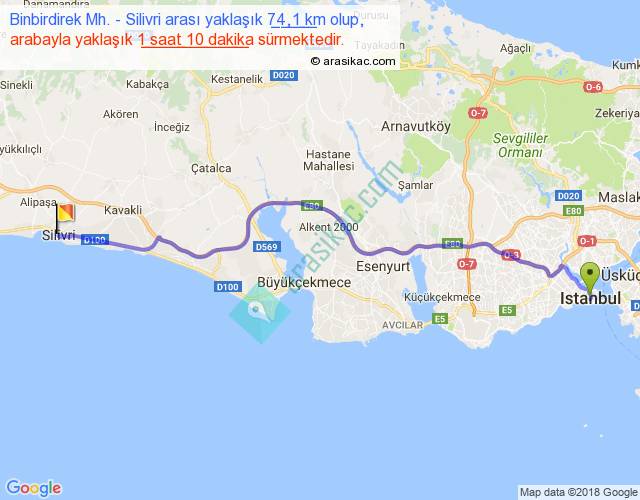 Binbirdirek Mh. - Silivri arası yaklaşık olarak 90 km/h ile yukarıda belirtilen sürede olup, iki yerin kuş uçuşu uzaklığı (mesafesi) 61'dir. Yolculuk otobüsle 1 saat 31 dakika sürmektedir.