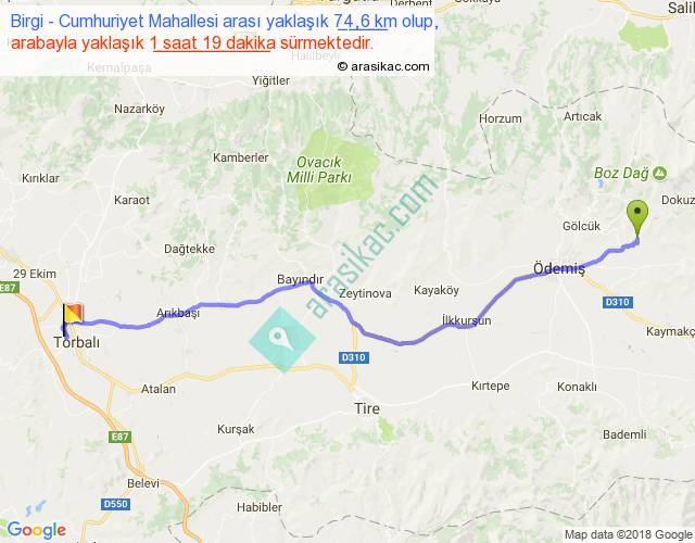 Birgi - Cumhuriyet Mahallesi arası yaklaşık olarak 90 km/h ile yukarıda belirtilen sürede olup, iki yerin kuş uçuşu uzaklığı (mesafesi) 64'dir. Yolculuk otobüsle 1 saat 42 dakika sürmektedir.