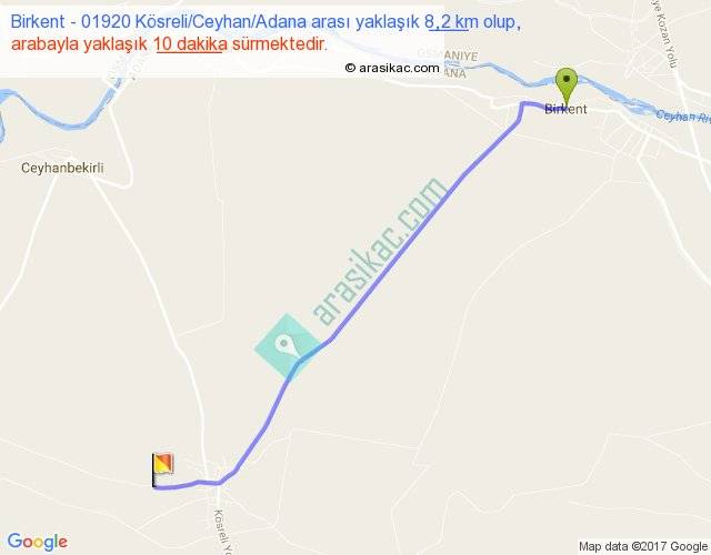 Birkent - 01920 Kösreli Ceyhan Adana arası yaklaşık olarak 90 km/h ile yukarıda belirtilen sürede olup, iki yerin kuş uçuşu uzaklığı (mesafesi) 8'dir. Yolculuk otobüsle 13 dakika sürmektedir.