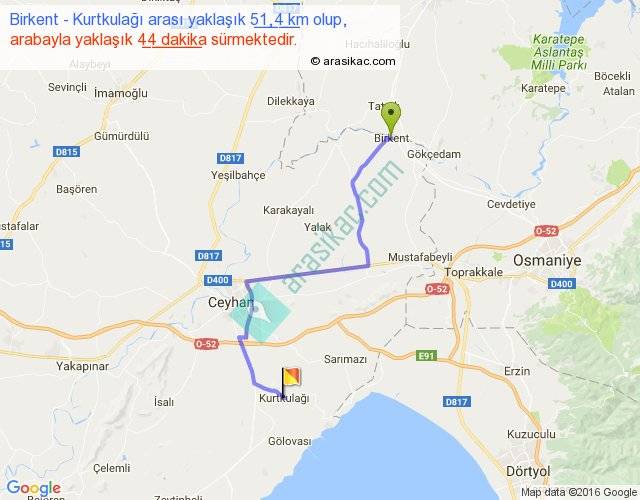 Birkent - Kurtkulağı arası yaklaşık olarak 90 km/h ile yukarıda belirtilen sürede olup, iki yerin kuş uçuşu uzaklığı (mesafesi) 34'dir. Yolculuk otobüsle 57 dakika sürmektedir.