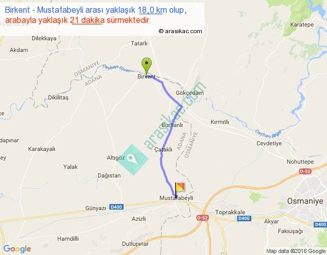 Birkent - Mustafabeyli arası yaklaşık olarak 90 km/h ile yukarıda belirtilen sürede olup, iki yerin kuş uçuşu uzaklığı (mesafesi) 15'dir. Yolculuk otobüsle 27 dakika sürmektedir.