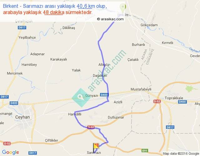Birkent - Sarımazı arası yaklaşık olarak 90 km/h ile yukarıda belirtilen sürede olup, iki yerin kuş uçuşu uzaklığı (mesafesi) 27'dir. Yolculuk otobüsle 1 saat 2 dakika sürmektedir.