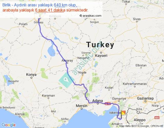Birlik - Aydınlı arası yaklaşık olarak 90 km/h ile yukarıda belirtilen sürede olup, iki yerin kuş uçuşu uzaklığı (mesafesi) 481'dir. Eğer belirtilen yerler arasında uçak seferi var ise bu süre uçakla 44 dakika'ya kadar düşebilir. Yolculuk otobüsle 8 saat 41 dakika sürmektedir.