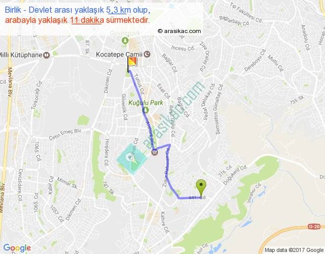 Birlik - Devlet arası yaklaşık olarak 90 km/h ile yukarıda belirtilen sürede olup, iki yerin kuş uçuşu uzaklığı (mesafesi) 4'dir. Yolculuk otobüsle 14 dakika sürmektedir.