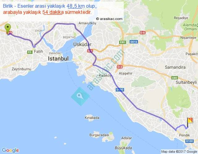 Birlik - Esenler arası yaklaşık olarak 90 km/h ile yukarıda belirtilen sürede olup, iki yerin kuş uçuşu uzaklığı (mesafesi) 37'dir. Yolculuk otobüsle 1 saat 10 dakika sürmektedir.