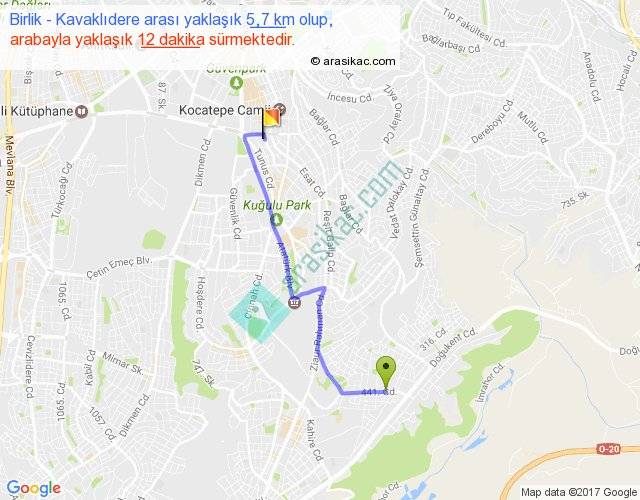 Birlik - Kavaklıdere arası yaklaşık olarak 90 km/h ile yukarıda belirtilen sürede olup, iki yerin kuş uçuşu uzaklığı (mesafesi) 4'dir. Yolculuk otobüsle 15 dakika sürmektedir.