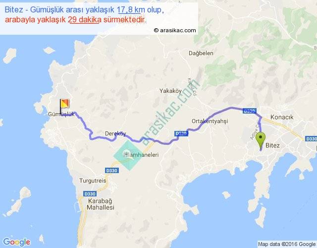 Bitez - Gümüşlük arası yaklaşık olarak 90 km/h ile yukarıda belirtilen sürede olup, iki yerin kuş uçuşu uzaklığı (mesafesi) 12'dir. Yolculuk otobüsle 37 dakika sürmektedir.