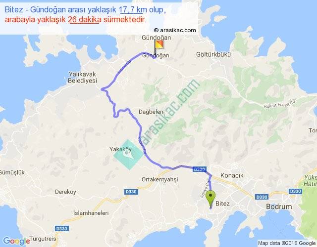 Bitez - Gündoğan arası yaklaşık olarak 90 km/h ile yukarıda belirtilen sürede olup, iki yerin kuş uçuşu uzaklığı (mesafesi) 10'dir. Yolculuk otobüsle 33 dakika sürmektedir.