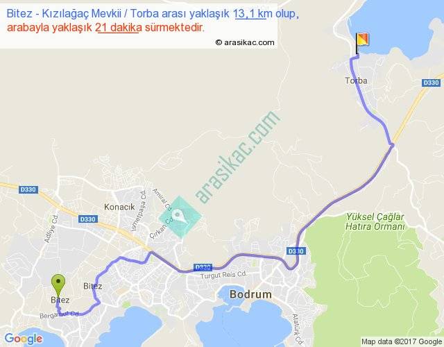 Bitez - Kızılağaç Mevkii Torba arası yaklaşık olarak 90 km/h ile yukarıda belirtilen sürede olup, iki yerin kuş uçuşu uzaklığı (mesafesi) 8'dir. Yolculuk otobüsle 27 dakika sürmektedir.