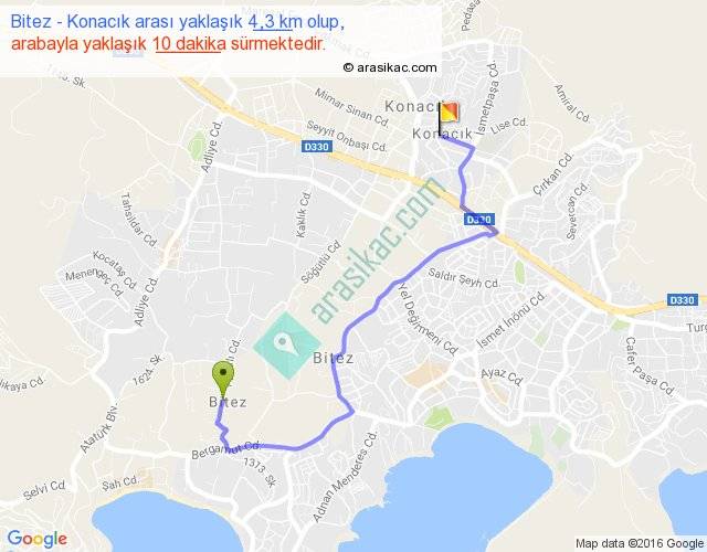 Bitez - Konacık arası yaklaşık olarak 90 km/h ile yukarıda belirtilen sürede olup, iki yerin kuş uçuşu uzaklığı (mesafesi) 2'dir. Yolculuk otobüsle 13 dakika sürmektedir.