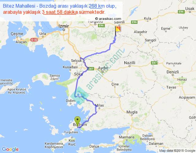 Bitez Mahallesi - Bozdağ arası yaklaşık olarak 90 km/h ile yukarıda belirtilen sürede olup, iki yerin kuş uçuşu uzaklığı (mesafesi) 156'dir. Yolculuk otobüsle 5 saat 9 dakika sürmektedir.