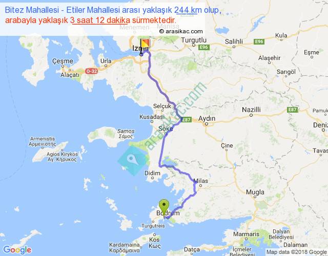 Bitez Mahallesi - Etiler Mahallesi arası yaklaşık olarak 90 km/h ile yukarıda belirtilen sürede olup, iki yerin kuş uçuşu uzaklığı (mesafesi) 155'dir. Yolculuk otobüsle 4 saat 9 dakika sürmektedir.
