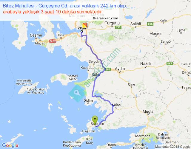 Bitez Mahallesi - Gürçeşme Cd. arası yaklaşık olarak 90 km/h ile yukarıda belirtilen sürede olup, iki yerin kuş uçuşu uzaklığı (mesafesi) 154'dir. Yolculuk otobüsle 4 saat 7 dakika sürmektedir.
