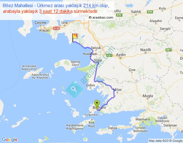Bitez Mahallesi - Ürkmez arası yaklaşık olarak 90 km/h ile yukarıda belirtilen sürede olup, iki yerin kuş uçuşu uzaklığı (mesafesi) 122'dir. Yolculuk otobüsle 4 saat 9 dakika sürmektedir.