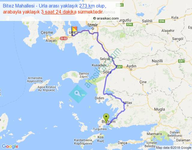 Bitez Mahallesi - Urla arası yaklaşık olarak 90 km/h ile yukarıda belirtilen sürede olup, iki yerin kuş uçuşu uzaklığı (mesafesi) 153'dir. Yolculuk otobüsle 4 saat 25 dakika sürmektedir.