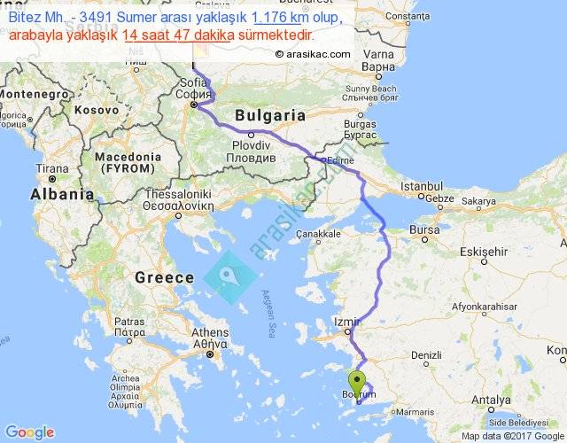 Bitez Mh. - 3491 Sumer arası yaklaşık olarak 90 km/h ile yukarıda belirtilen sürede olup, iki yerin kuş uçuşu uzaklığı (mesafesi) 776'dir. Eğer belirtilen yerler arasında uçak seferi var ise bu süre uçakla 1 saat 11 dakika'ya kadar düşebilir. Yolculuk otobüsle 19 saat 13 dakika sürmektedir.