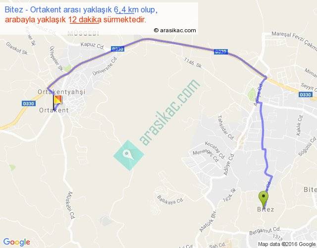 Bitez - Ortakent arası yaklaşık olarak 90 km/h ile yukarıda belirtilen sürede olup, iki yerin kuş uçuşu uzaklığı (mesafesi) 4'dir. Yolculuk otobüsle 15 dakika sürmektedir.