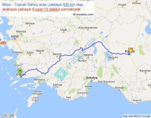 Bitez - Toprak Sarnıç arası yaklaşık olarak 90 km/h ile yukarıda belirtilen sürede olup, iki yerin kuş uçuşu uzaklığı (mesafesi) 454'dir. Eğer belirtilen yerler arasında uçak seferi var ise bu süre uçakla 41 dakika'ya kadar düşebilir. Yolculuk otobüsle 10 saat 40 dakika sürmektedir.