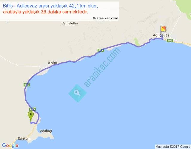 Bitlis - Adilcevaz arası yaklaşık olarak 90 km/h ile yukarıda belirtilen sürede olup, iki yerin kuş uçuşu uzaklığı (mesafesi) 70'dir. Yolculuk otobüsle 1 saat 29 dakika sürmektedir.
