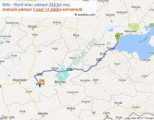 Bitlis - Bismil arası yaklaşık olarak 90 km/h ile yukarıda belirtilen sürede olup, iki yerin kuş uçuşu uzaklığı (mesafesi) 177'dir. Yolculuk otobüsle 4 saat 12 dakika sürmektedir.