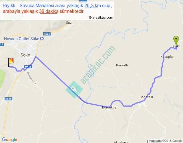 Bıyıklı - Savuca Mahallesi arası yaklaşık olarak 90 km/h ile yukarıda belirtilen sürede olup, iki yerin kuş uçuşu uzaklığı (mesafesi) 18'dir. Yolculuk otobüsle 49 dakika sürmektedir.