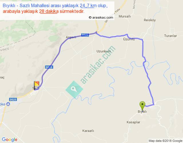 Bıyıklı - Sazlı Mahallesi arası yaklaşık olarak 90 km/h ile yukarıda belirtilen sürede olup, iki yerin kuş uçuşu uzaklığı (mesafesi) 12'dir. Yolculuk otobüsle 36 dakika sürmektedir.