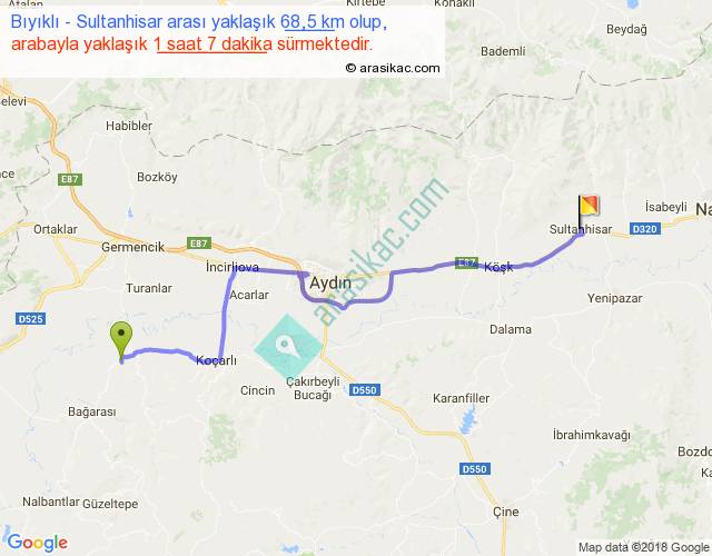 Bıyıklı - Sultanhisar arası yaklaşık olarak 90 km/h ile yukarıda belirtilen sürede olup, iki yerin kuş uçuşu uzaklığı (mesafesi) 52'dir. Yolculuk otobüsle 1 saat 27 dakika sürmektedir.