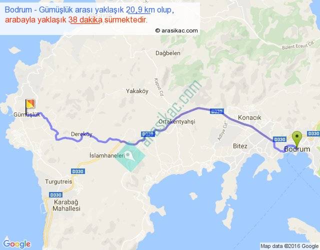Bodrum - Gümüşlük arası yaklaşık olarak 90 km/h ile yukarıda belirtilen sürede olup, iki yerin kuş uçuşu uzaklığı (mesafesi) 17'dir. Yolculuk otobüsle 49 dakika sürmektedir.