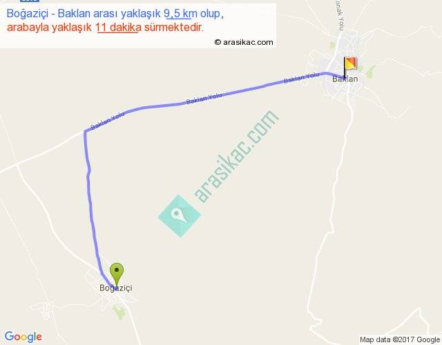 Boğaziçi - Baklan arası yaklaşık olarak 90 km/h ile yukarıda belirtilen sürede olup, iki yerin kuş uçuşu uzaklığı (mesafesi) 7'dir. Yolculuk otobüsle 14 dakika sürmektedir.