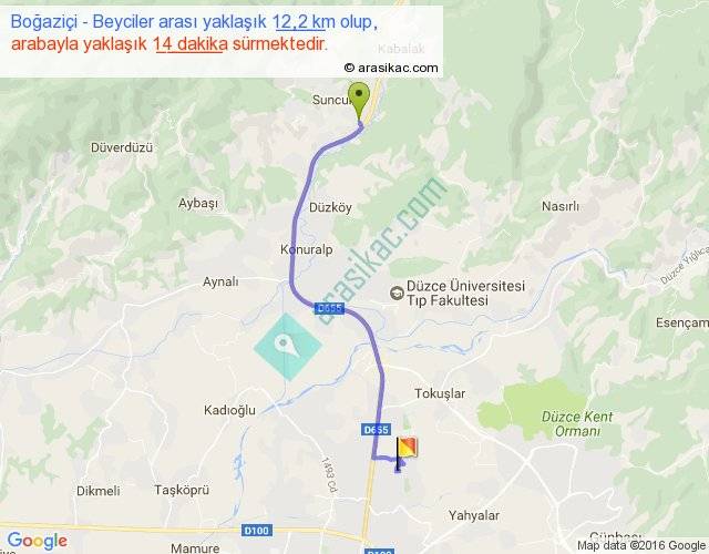 Boğaziçi - Beyciler arası yaklaşık olarak 90 km/h ile yukarıda belirtilen sürede olup, iki yerin kuş uçuşu uzaklığı (mesafesi) 9'dir. Yolculuk otobüsle 18 dakika sürmektedir.