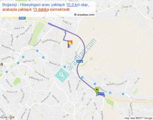 Boğaziçi - Hüseyingazi arası yaklaşık olarak 90 km/h ile yukarıda belirtilen sürede olup, iki yerin kuş uçuşu uzaklığı (mesafesi) 3'dir. Yolculuk otobüsle 16 dakika sürmektedir.