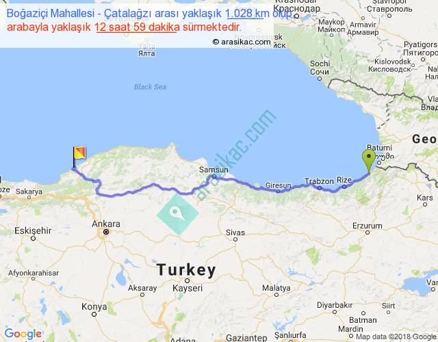 Boğaziçi Mahallesi - Çatalağzı arası yaklaşık olarak 90 km/h ile yukarıda belirtilen sürede olup, iki yerin kuş uçuşu uzaklığı (mesafesi) 781'dir. Eğer belirtilen yerler arasında uçak seferi var ise bu süre uçakla 1 saat 12 dakika'ya kadar düşebilir. Yolculuk otobüsle 16 saat 52 dakika sürmektedir.