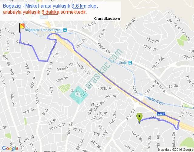 Boğaziçi - Misket arası yaklaşık olarak 90 km/h ile yukarıda belirtilen sürede olup, iki yerin kuş uçuşu uzaklığı (mesafesi) 2'dir. Yolculuk otobüsle 7 dakika sürmektedir.